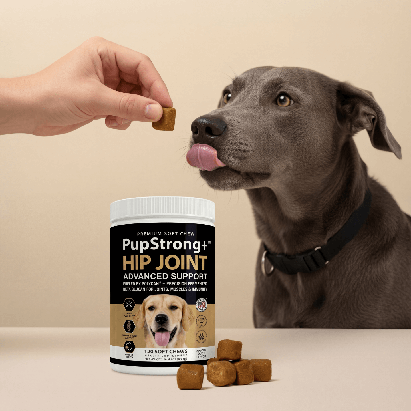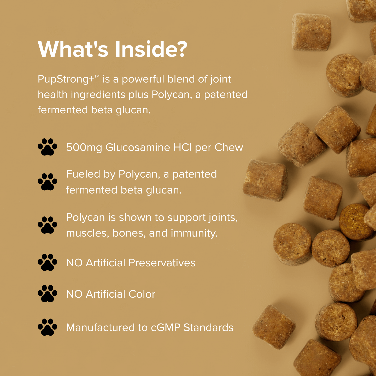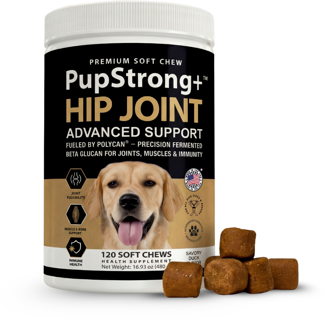 Stop settling for basic. PupStrong+ is the only dog supplement combining trusted joint essentials (Glucosamine, MSM, Green-Lipped Mussel) with the breakthrough power of Polycan® Precision Fermented Beta Glucan.